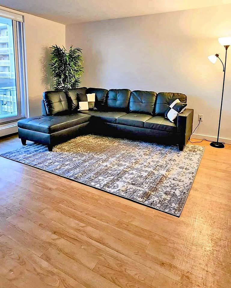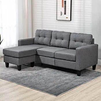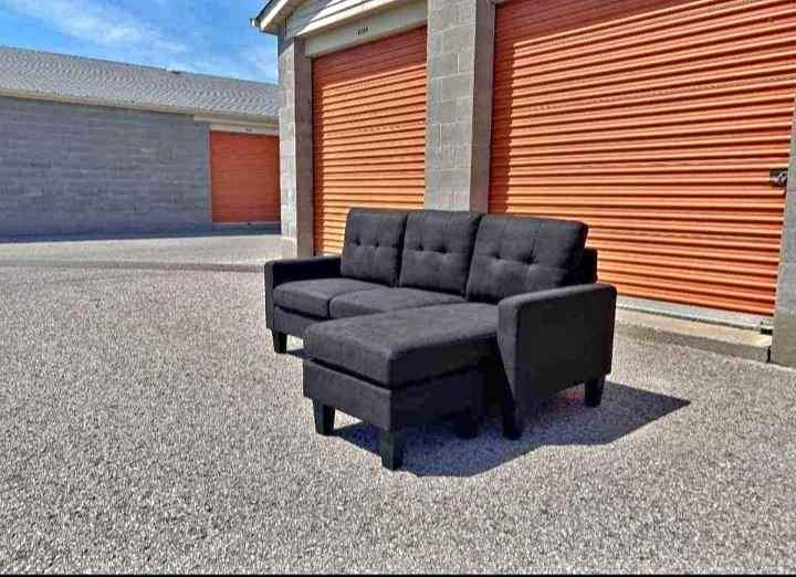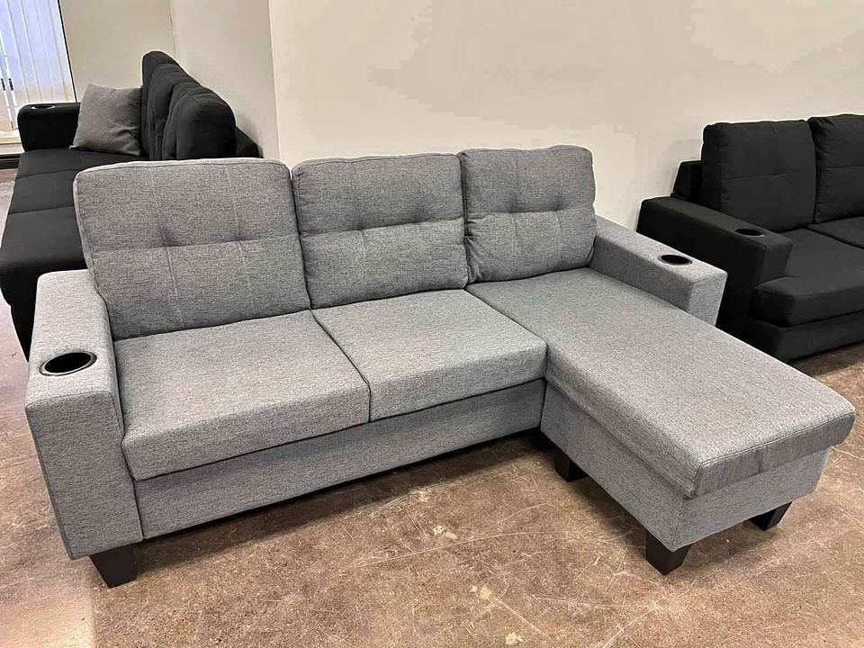 Black and grey sectional couch in soft linen fabric. Reversible chaise with cupholders and detachable back cushions. Comfortable and stylish.